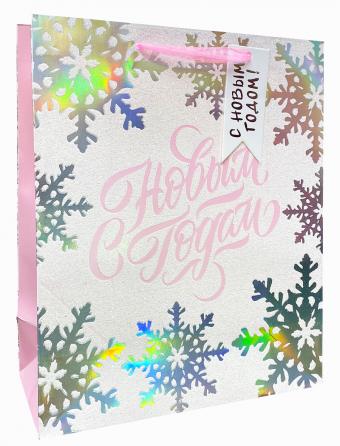 Бумажные новогодние подарочные пакеты из плотной бумаги с голографическим тиснением и перламутровыми блёстками, серия "С Новым годом!", размер 26*32*12 см.