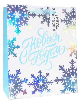 Бумажные новогодние подарочные пакеты из плотной бумаги с голографическим тиснением и перламутровыми блёстками, серия "С Новым годом!", размер 26*32*12 см.