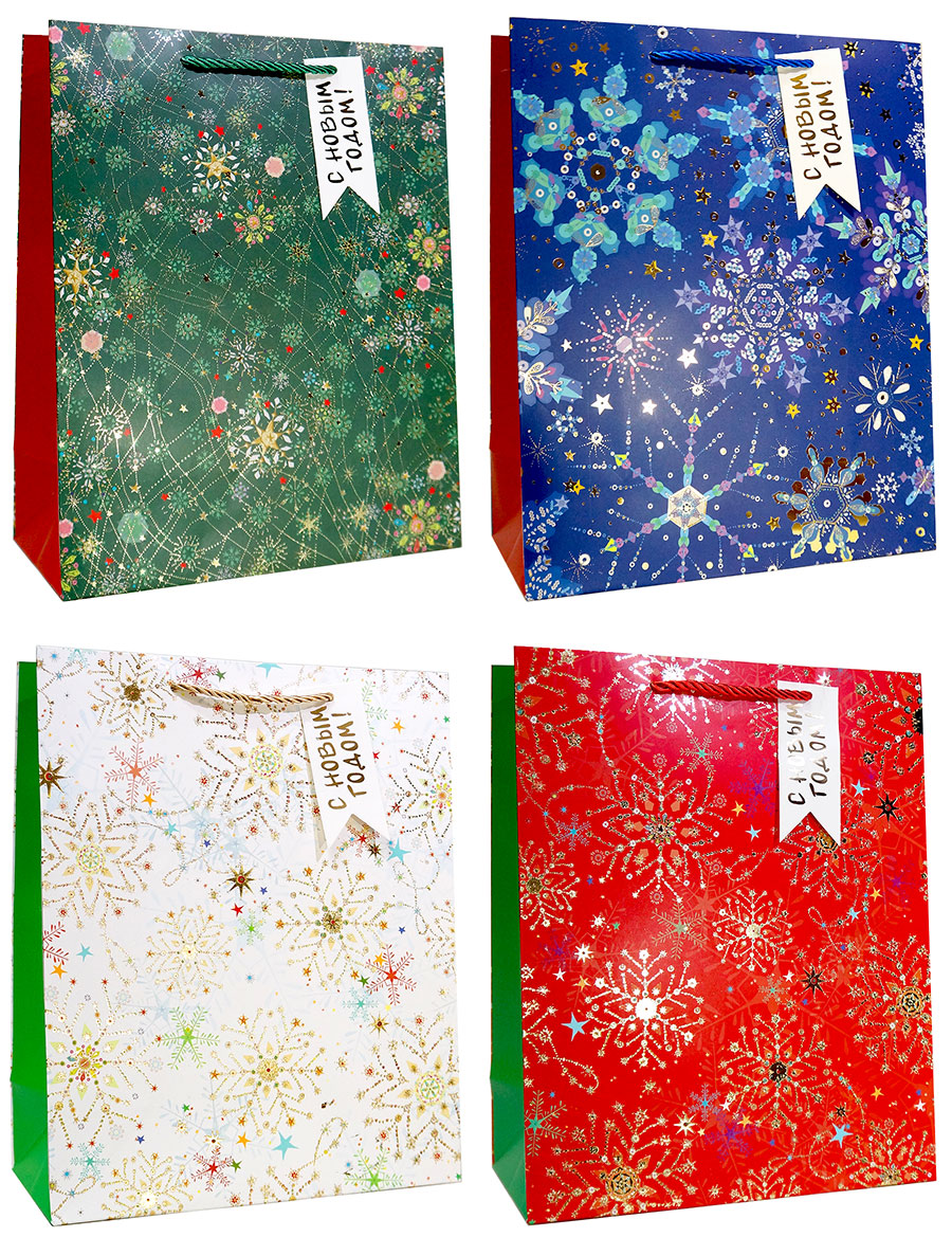 Новогодние бумажные подарочные пакеты-сумки из плотной матовой бумаги с золотым металлизированным тиснением и рисунком, серия "Яркие снежинки".