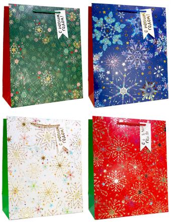 Бумажные новогодние подарочные пакеты из плотной матовой бумаги с золотым тиснением, серия "Яркие снежинки", размер 30*40*12 см.