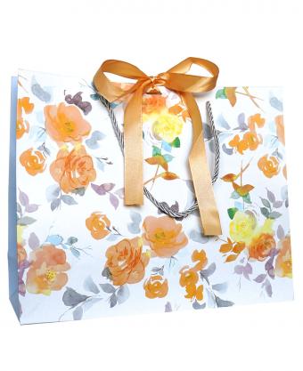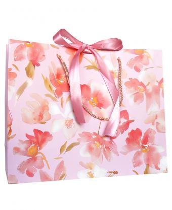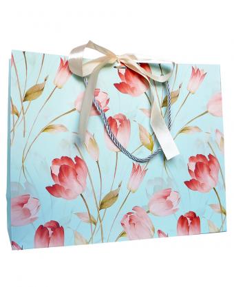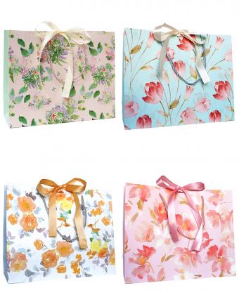 Горизонтальные бумажные подарочные пакеты из плотной матовой бумаги с рисунком и лентами, серия "Весенние цветы", размер 24,5*19,5*9,5 см.