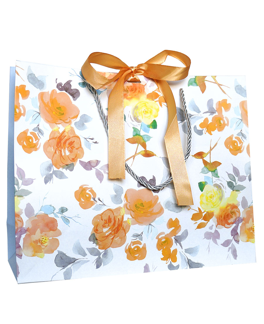 Горизонтальные бумажные подарочные пакеты из плотной матовой бумаги с рисунком и лентами, серия "Полевые цветы", размер 32*26*11 см.