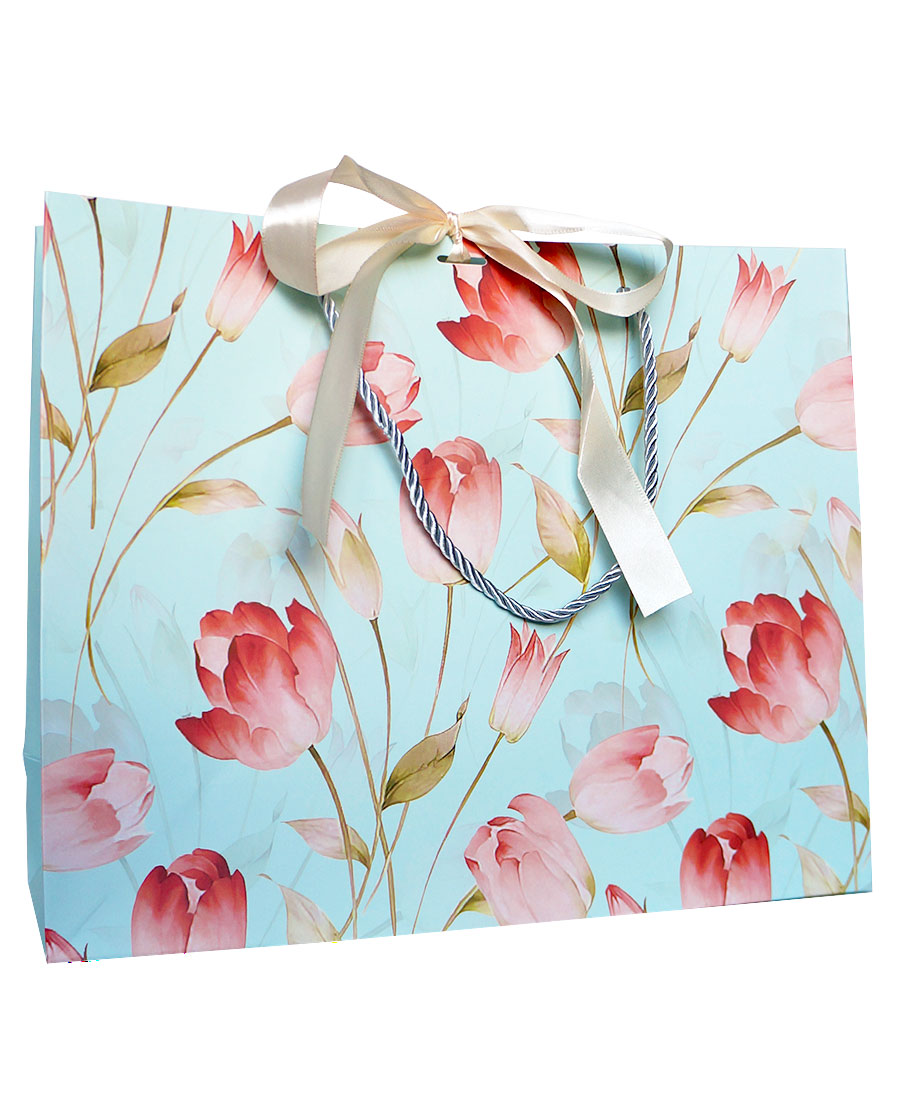 Горизонтальные бумажные подарочные пакеты из плотной матовой бумаги с рисунком и лентами, серия "Весенние цветы", размер 24,5*19,5*9,5 см.