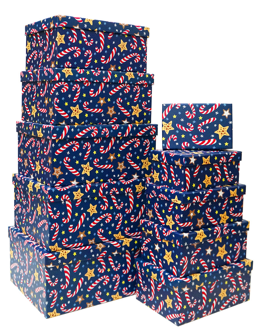 Набор из десяти новогодних прямоугольных подарочных коробок, расцветка "Звёздочки на синем фоне". Коробки изготовлены из плотного картона, отделка подарочных коробок выполнена матовой бумагой с новогодним рисунком.