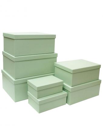 Набор из семи прямоугольных подарочных коробок, цвет мятный. Коробки изготовлены из плотного картона, отделка подарочных коробок выполнена матовой однотонной бумагой.