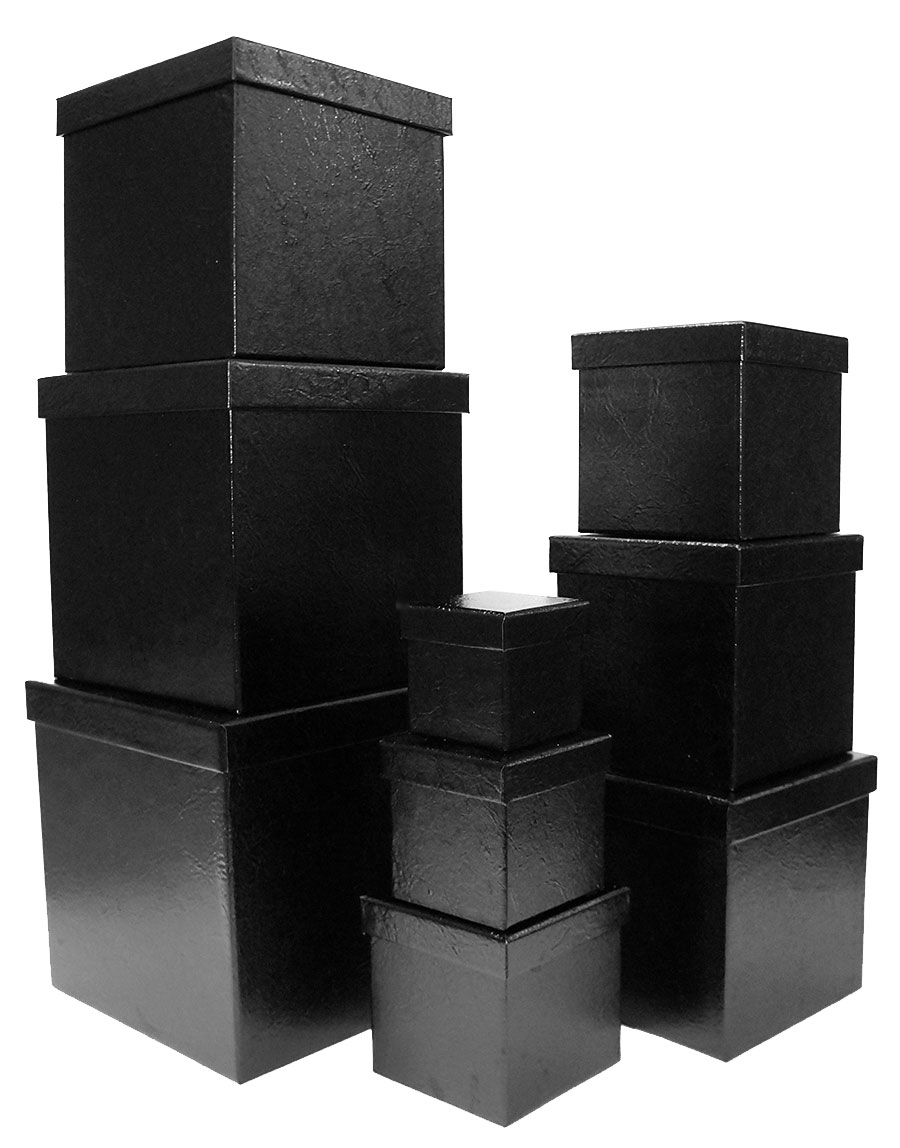 Набор из девяти чёрных подарочных коробок в форме куба. Коробки изготовлены из плотного картона, отделка подарочных коробок выполнена фактурной перламутровой чёрной бумагой.