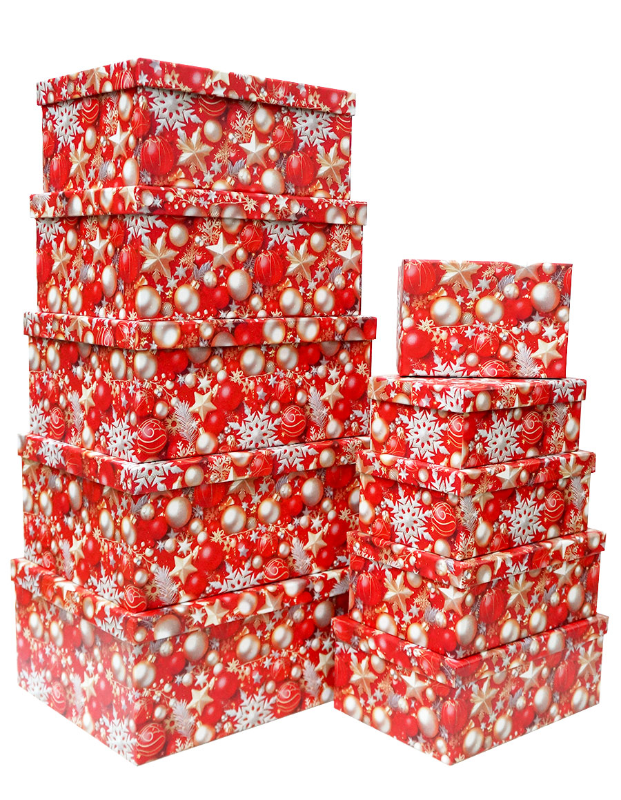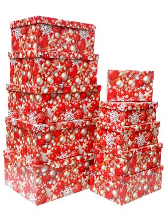 Набор из десяти новогодних прямоугольных подарочных коробок, расцветка "Красные игрушки". Коробки изготовлены из плотного картона, отделка подарочных коробок выполнена матовой бумагой с новогодним рисунком.
