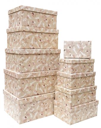 Набор из десяти новогодних прямоугольных подарочных коробок, расцветка "Веточки и шишки". Коробки изготовлены из плотного картона, отделка подарочных коробок выполнена матовой бумагой с новогодним рисунком.