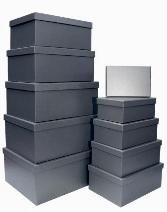 ПродукцияКоробки подарочные Набор из десяти прямоугольных подарочных коробок графитового цвета, отделка фактурной матово-перламутровой дизайнерской бумагой, размер 37*28*17 см.